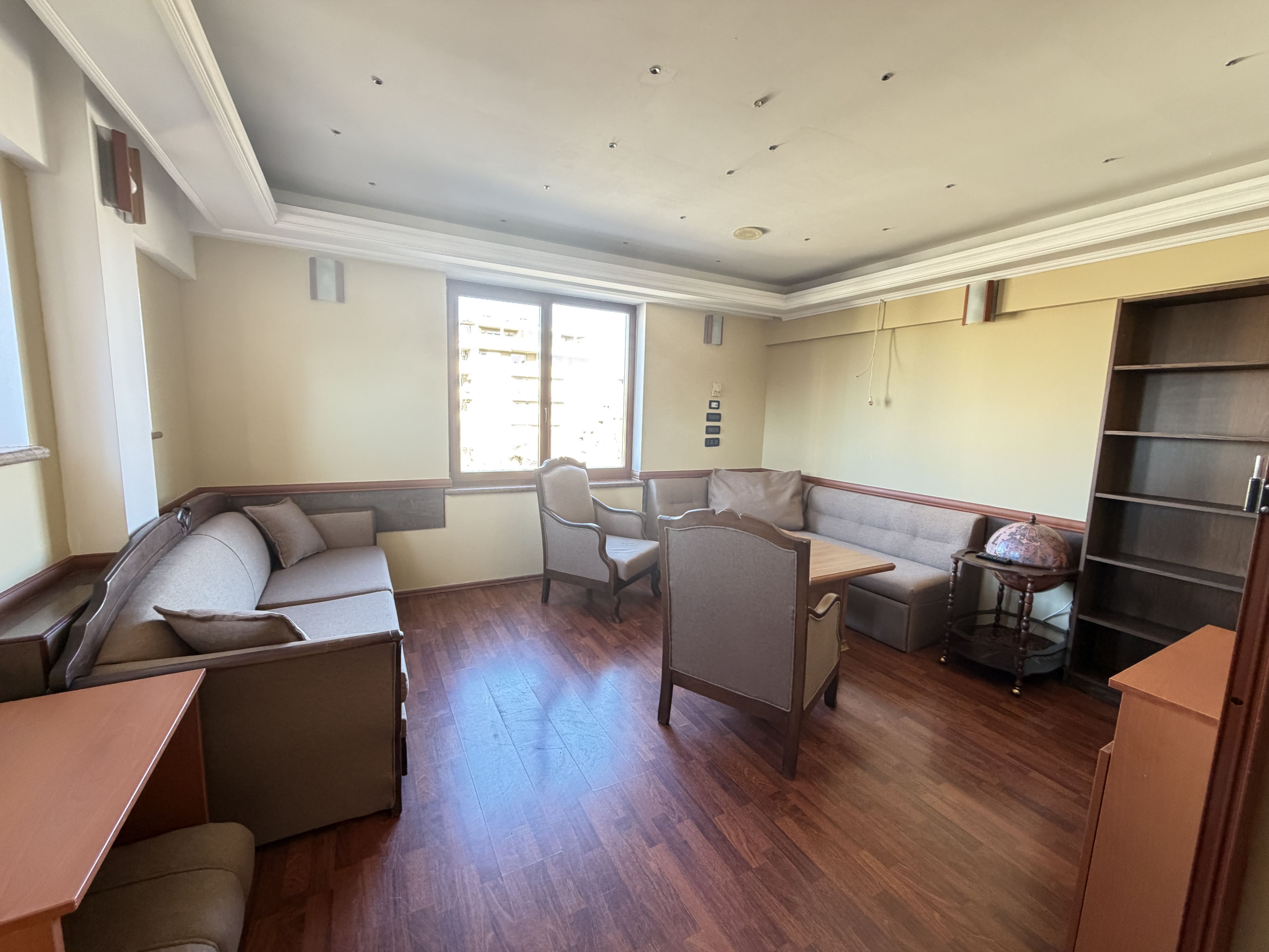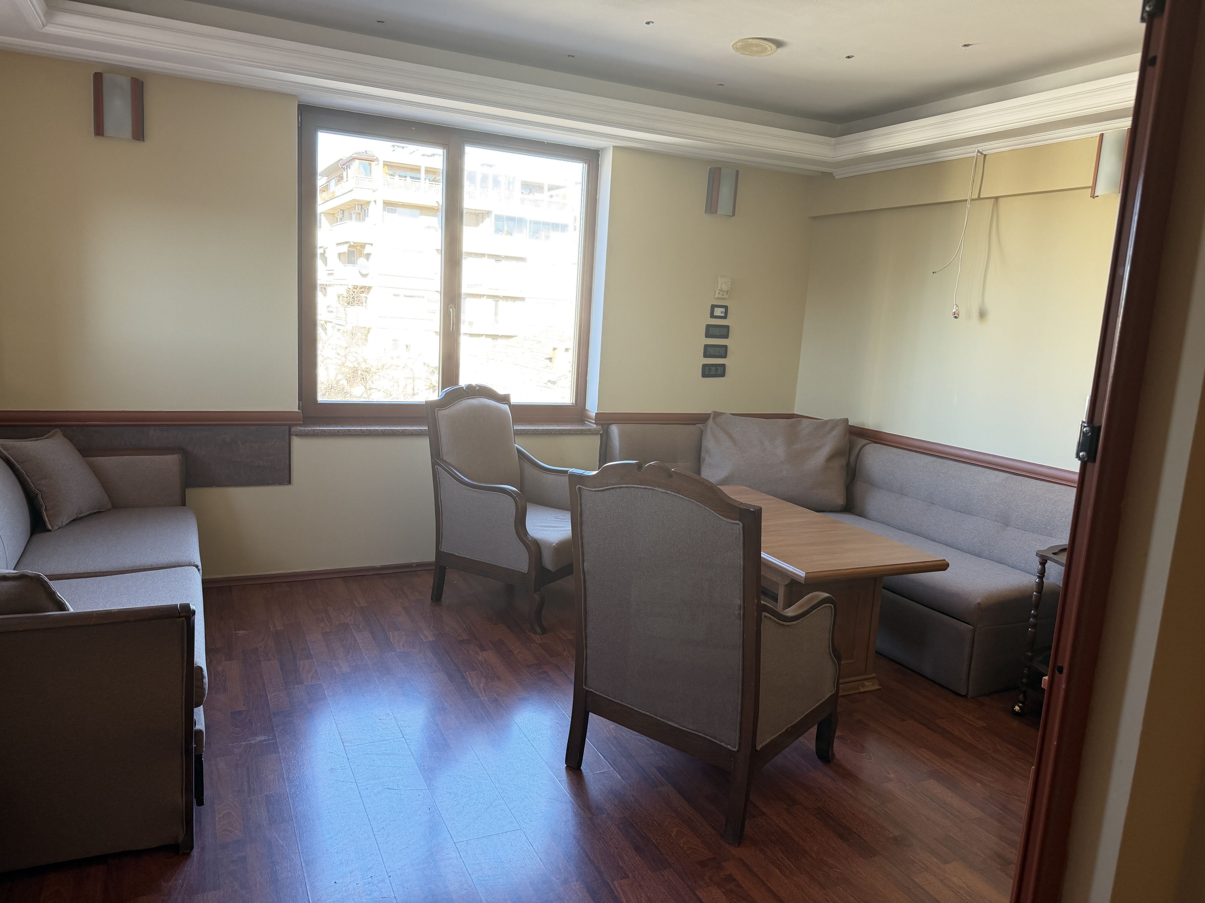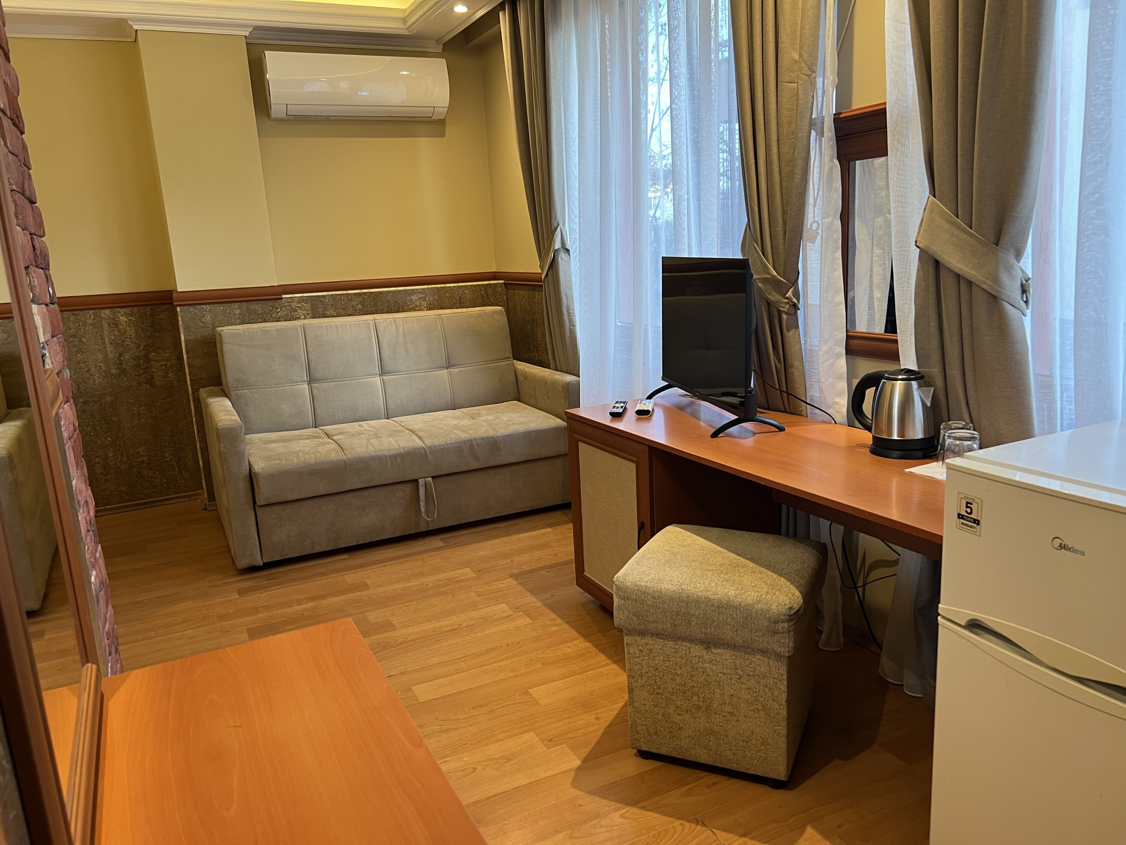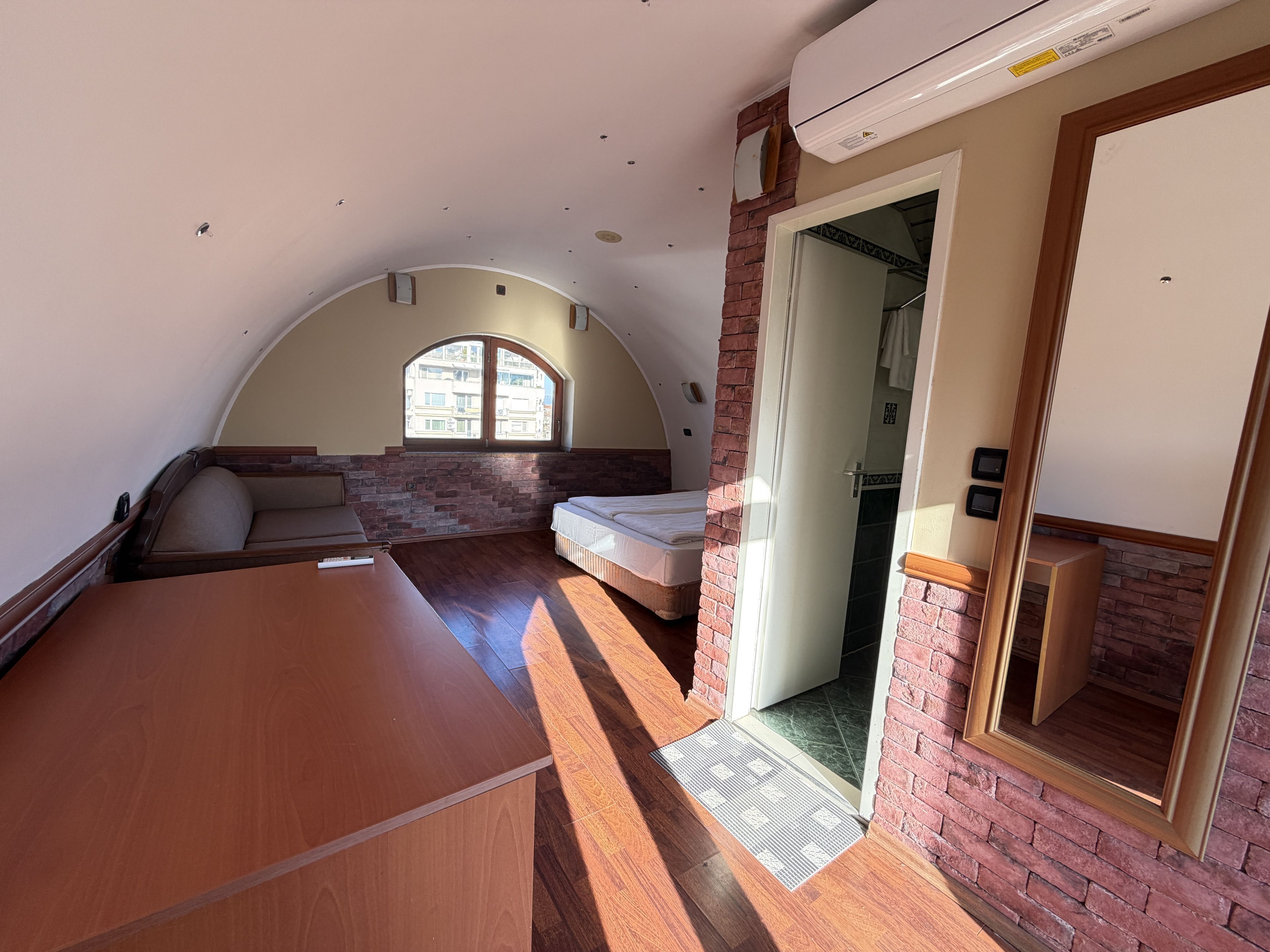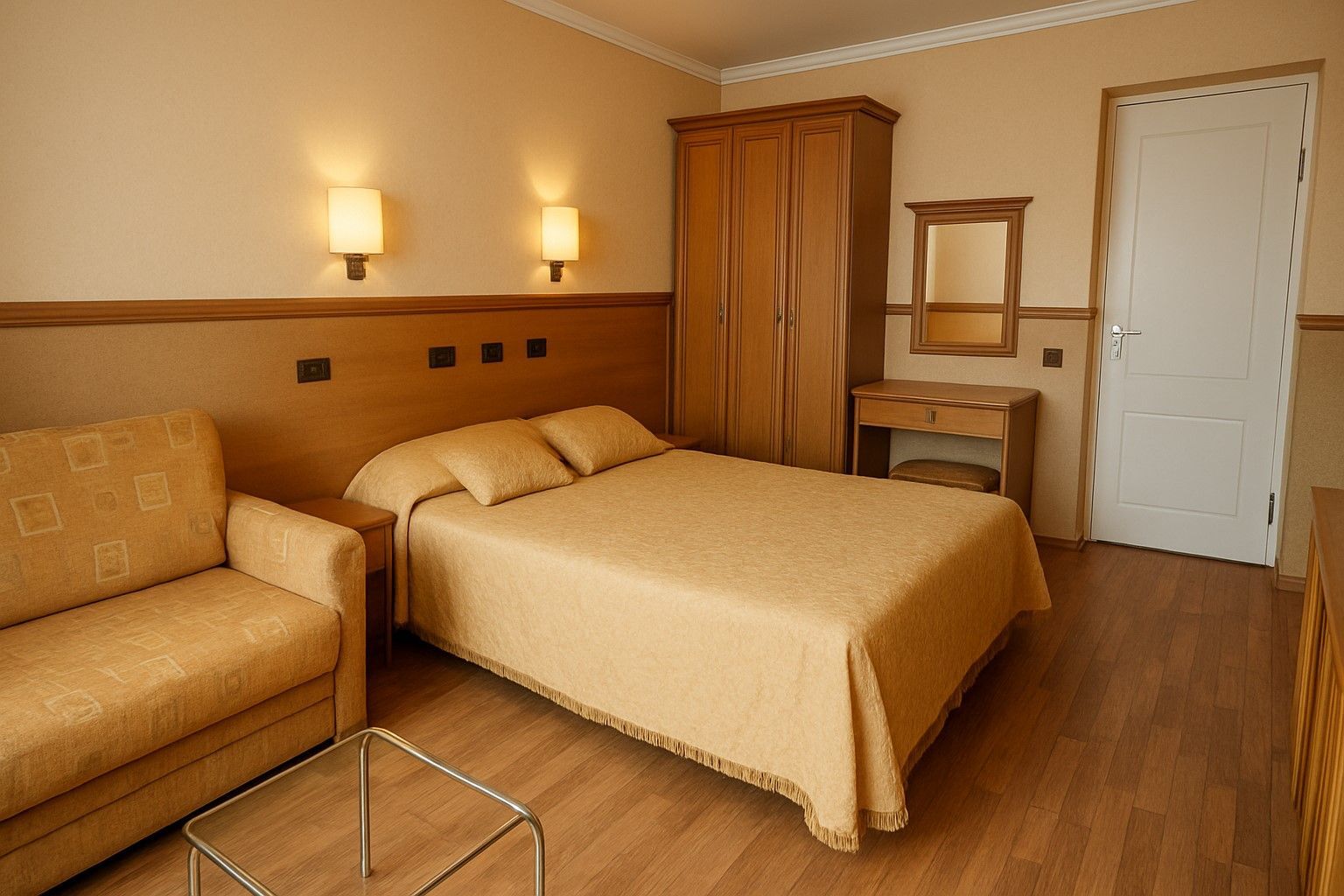 Стаята е оборудвана с диван, бюро тоалетка