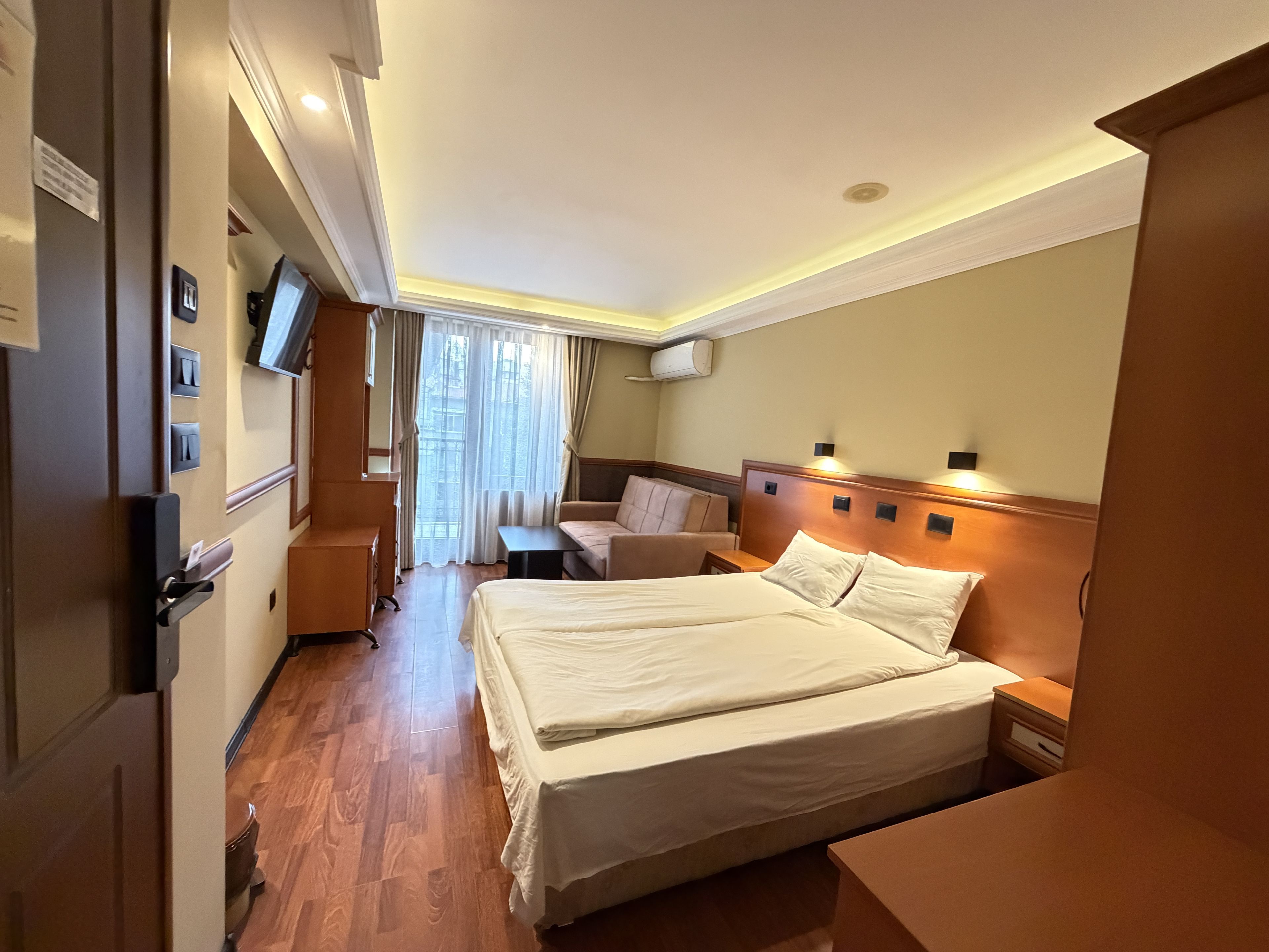 Делукс стаята предлага повече пространство и собствен балкон, осигуряващ естествена светлина и допълнителен комфорт. Това е най-предпочитаната категория от нашите гости, съчетаваща удобство, тишина и приятна градска атмосфера.